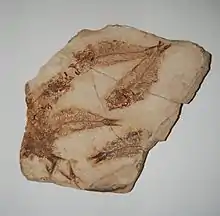 Shown is one of several slabs of diatomaceous sandstone with abundant fossil fish (perhaps a species of herring) collected in the 1970s from the area now underneath the Mulholland Estates security gate/access road. Many hundreds if not thousands of these 5 1/2 inch fish must have encountered an area of low oxygen content and all died at once.