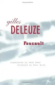 Foucault is a 1986 book on the work of Michel Foucault by the philosopher Gilles Deleuze.[1] Deleuze, like in his other works on major philosophers, thinks along with Foucault instead of trying to write a guide to his philosophy. The book focuses on the conceptual underpinnings of Foucault's extensive work by considering in depth two of his paradigmatic works, The Archaeology of Knowledge (1969) and Discipline and Punish (1975).
