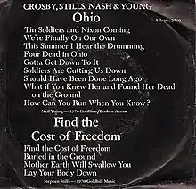 "Ohio" is a protest song and counterculture anthem written and composed by Neil Young in reaction to the Kent State shootings of May 4, 1970, and performed by Crosby, Stills, Nash & Young.[1] It was released as a single, backed with Stephen Stills's "Find the Cost of Freedom", peaking at number 14 on the US Billboard Hot 100 and number 16 in Canada.[2] Although live versions of "Ohio" and "Find the Cost of Freedom" were included on the group's 1971 double album 4 Way Street, the studio versions of both songs did not appear on an LP until the group's compilation So Far was released in 1974. The song also appeared on the Neil Young compilation albums Decade, released in 1977, and Greatest Hits, released in 2004.