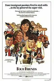 Four Friends is a 1981 American comedy-drama film directed by Arthur Penn. The semi-autobiographical screenplay by Steve Tesich follows the path of the title characters from high school to college during the often turbulent 1960s and beyond. The cast features Craig Wasson, Jodi Thelen, Jim Metzler and Glenne Headly.