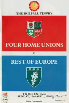 Four Home Unions v Rest of Europe was a rugby union match played in 1990 to raise money for the rebuilding of Romania following the overthrow of Nicolae Ceaușescu in December 1989. [1] The Four Home Unions team's logo was that used by the British & Irish Lions. The Rest of Europe played under the badge of the Romanian Rugby Federation. The match was played at Twickenham, and the Four Home Unions won the match 43–18 with England captain Will Carling scoring two tries. The winners were awarded The Skilball Trophy.