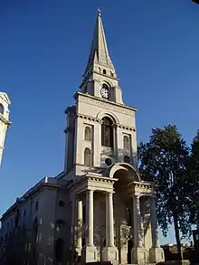 Fournier Street also has the church of Christ Church Spitalfields at its western extremity, designed by Nicholas Hawksmoor, a former assistant of Christopher Wren, and built between 1714 and 1729. This Grade 1 listed building is widely considered to be the highest expression of English Baroque architecture.[12] The foundations were laid in 1714, and construction of the walls took place over the following years, although the upper stages of the tower and spire were not built until the late 1720s, and the church was finally consecrated on 5 July 1729.[2]
