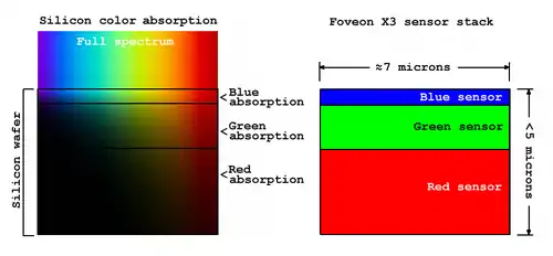The diagram to the right depicts how the Foveon X3 sensor works. The image on the left shows the absorption of colors for each wavelength as it passes through the silicon wafer. The image on the right shows a layered sensor stack depicting the colors it detects at each absorption level for each output pixel. The sensor colors shown are only examples. In practice, the color attributes of each output pixel using this sensor result from the camera's image processing algorithms, which use a matrix process to construct a single RGB color from all the data sensed by the photodiode stack.[2]