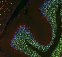 NeuN antibodies are widely used to label neurons, despite some shortcomings, and a January 2023 Pubmed search using the keyword "NeuN" produced 4200 hits.[4] A few neuronal cell types are not recognized by NeuN antibodies, such as Purkinje cells, stellate and Golgi cells of the cerebellum, olfactory Mitral cells, retinal photoreceptors and spinal cord gamma motor neurons. However the vast majority of neurons are strongly NeuN positive, and NeuN immunoreactivity has been widely used to identify neurons in tissue culture and in sections and to measure the neuron/glia ratio in brain regions.[5] NeuN immunoreactivity becomes obvious as neurons mature, typically after they have downregulated expression of Doublecortin, a marker seen in the earliest stages of neuronal development.