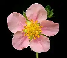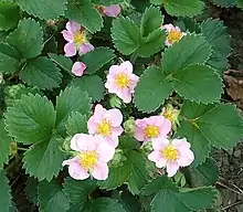 - 'Frel', also known as Pink Panda,[2] is a patented hybrid strawberry that is the result of crossing the garden strawberry Fragaria × ananassa subsp. cuneifolia (syn. Fragaria grandiflora)[3] with Marsh Cinquefoil, Comarum palustre (formerly Potentilla palustris), followed by backcrossing to strawberry.[4] The plant is grown for ornamental purposes. It has bright pink flowers (in contrast to the white flowers of naturally occurring strawberry species) and it produces a small number of strawberries.[4]