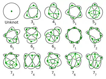 The simplest knot, called the unknot or trivial knot, is a round circle embedded in R3.[4] In the ordinary sense of the word, the unknot is not "knotted" at all. The simplest nontrivial knots are the trefoil knot (31 in the table), the figure-eight knot (41) and the cinquefoil knot (51).[5]