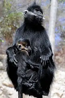 Infants are born with bright orange coloured fur, which fades to black throughout the period of infancy lasting several months. It is not known why their coats are so conspicuous, but current hypotheses suggest it may elicit attention, protection and caregiving by adults.[6]