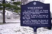 On 25 March 1736, Vincennes was burnt by the Chickasaw Indians, along with other captive French at the village of Ogoula Tchetoka, near the present site of Fulton, Mississippi,[5][6] although the historical marker in Vincennes (pictured in this article) gives the location as Fulton, Tennessee. They were captured as the result of ill-advised raids in coordination with Pierre D'Artaguiette. The raids are now known as the Chickasaw Campaign of 1736 of the Chickasaw Wars.[7]