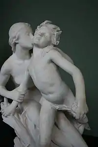 Another well-known sculpture, Les Violettes, depicts a group of nude children with an older girl who may be their mother or older sister. Their bodies are entwined with flower stems and leaves and they are all wearing petal bonnets, suggesting that they are meant to represent the spirits of flowers.
