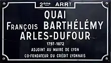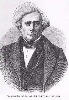 François Barthélemy Arlès-Dufour (3 June 1797 – 21 January 1872) was a French silk merchant and leading exponent of Saint-Simonianism. He was born to a poor family, had little formal education and began work in a shawl factory at the age of 16. Later he joined a silk company based in Leipzig, Germany, married into the owners' family and was placed in charge of its Lyon operations. Working first for his in-laws and then independently, he made a fortune in silk. Arlès-Dufour also became involved in banking, railways and the Suez canal project. He played an important role in the Lyon Chamber of Commerce, and as a member of the jury in various international expositions. He believed in free trade and in social institutions that would help the most disadvantaged social classes.