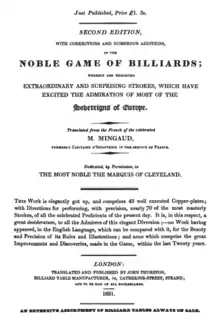 Circa 1830, this book was translated and published in English by the Billiards table Manufacturer John Thurston of 14 Catherine Street, The Strand.[3] It was published in English as :