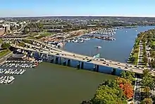 Though a Washington Channel Bridge had been proposed as far back as 1931, planning for the bridge that was built wasn't started until 1952 and all of the bridge's elements weren't completed until the 1970s.[2] In the early 1950s planners recognized the need to connect the planned Southwest Freeway in DC with Shirley Highway in Arlington to serve as part of the inner loop. This would require new bridges across the Potomac and the Washington Channel. The original 1952 proposal was to build a bridge in a straight line from 10th an F to Roaches Run. It required closing multiple blocks of Virginia Avenue to build a half circle south of Independence Avenue - thus creating a new Smithsonian site, rebuilding 10th Street and removing numerous structures.[3] By 1955, a proposal from NCPC shifted the Potomac Bridge north to 14th Street, necessitating an S-curve across the Channel Bridge and the highway on East Potomac Island. Despite opposition from the National Park Service to running the highway so close to the Lincoln Memorial, this is the design that was eventually approved.[4] After additional planning and approvals, Federal and District officials broke ground for the $8 million Washington Channel Bridge on August 20, 1959, though work on the piers had started earlier that summer.[5][6] During construction they moved the historic Maine Avenue fish market to make room for the bridge.[7] The bridge, along with the 12th Street Expressway, opened on July 31, 1962.[8] When South Dakota Senator Francis H. Case died a little more than a month before the bridge opened, a bill was introduced to rename the bridge for him in honor of his role as an architect of the 23rd Amendment which granted DC residents the right to vote for Electoral College electors, and for his years of service on the Senate Committee on the District of Columbia.[9] The bill passed in 1965 and the bridge was renamed.[10]
