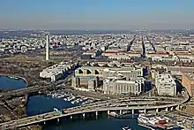 - " A photo from 1973 and a map from 1982 show the Circle without and with the causeway." Swanson, Dick (April 1973). "Southwest Washington, D.C. With South End Of L'Enfant Plaza In Foreground, Southwest Freeway, Department Of Agriculture And Washington Monument Beyond, April 1973". Flickr.com. Retrieved 22 July 2019.