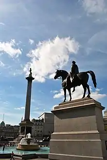 He made a bronze equestrian statue of Sir Thomas Munro for Madras (now Chennai)[15][24] and another of King George IV, originally commissioned, on the instructions of the king himself, to stand on top of the Marble Arch, in front of Buckingham Palace, but eventually placed in Trafalgar Square.[24][30] The horses in these two works are identical.[29] A third, of the Duke of Wellington for a site in front of the Royal Exchange in London, was completed after Chantrey's death.[24]