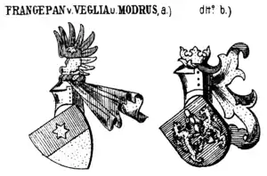 The Frankopan family was one of the leading Croatian aristocratic families from the 12th to the 17th century. Since the 15th century they were trying to link themselves to the Roman patrician Frangipani family (which claimed descent from a Roman plebeian family of Anicii and ended in 1654 with Mario Frangipane being its last male descendant[5]). However Croatian Encyclopedia,[4] Italian Encyclopedia[6] and German Biographical Lexicon of the History of Southeastern Europe[7] by the Leibniz Institute for East and Southeast European Studies highly question the bloodline connection between the two families and remind of the common fashion of medieval noble families in Europe to try and connect themselves to ancient Roman nobility. Along with the members of the Zrinski family the Frankopan ranked high in terms of importance by virtue of power, wealth, fame, glory and role in Croatian and Hungarian history. The first known member of Croatian lineage of the Frankopan family was Dujam I Krčki (Doymus Veglenfis in Latin sources that also attribute the title of comes to him[8][9]), lord of Krk who received permission by Domenico Michieli, Doge of Venice from 1118 to 1130, to rule the island of Krk as vassal of the Republic of Venice.[4][2] His exact origin is unknown, but he and his descendants were referred to as the Counts of Krk in historical documents.[4][6][2] In 1221, the brothers Henry and Servidon Frankopan received the islands of Brač, Hvar, Korčula and Lastovo as a gift from King Andrew II of Hungary for their services.[10] In 1428 Nikola IV Krčki (Ban of Croatia and Dalmatia from 1426 to 1432) was the first of the Counts of Krk to call himself Frankapan.[11] In 1430 he managed to receive recognition from Pope Martin V for being a descendant of the old Roman patrician family Frangipani and officially started using the name and coat of arms Frangipani.[1][11]