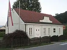 Franjo Tuđman was born on 14 May 1922 in Veliko Trgovišće, a village in the northern Croatian region of Hrvatsko Zagorje, at the time part of the Kingdom of Serbs, Croats and Slovenes. The family moved to the house marked as his birthplace soon after he was born.[5][6] His father Stjepan ran a local tavern and was a politically active member of the Croatian Peasant Party (HSS).[7] He had been president of the HSS committee in Veliko Trgovišće for 16 years (1925–1941 and had been elected as mayor of Veliko Trgovišće in 1936 and 1938).[8] Mato, Andraš and Juraj, brothers of Stjepan Tuđman, emigrated to the United States.[9] Another brother, Valentin, also tried to emigrate, but a travelling accident prevented him and kept him in Veliko Trgovišće, where he worked as an (uneducated) veterinarian.[9]