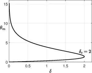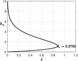 The above equation is nothing but Emden–Chandrasekhar equation,[16] which appears in astrophysics describing isothermal gas sphere. Unlike planar and cylindrical case, the spherical vessel has infinitely many solutions for oscillating about the point ,[17] instead of just two solutions, which was shown by Israel Gelfand.[18] The lowest branch will be chosen to explain explosive behavior.