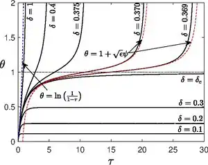 In the near-critical condition, i.e., when , the system takes very long time to explode. The analysis for this limit was first carried out by Frank-Kamenetskii.[10], although proper asymptotics were carried out only later by D. R. Kassoy and Amable Liñán[11] including reactant consumption because reactant consumption is not negligible when . A simplified analysis without reactant consumption is presented here. Let us define a small parameter such that . For this case, the time evolution of is as follows: first it increases to steady-state temperature value corresponding to , which is given by at times of order , then it stays very close to this steady-state value for a long time before eventually exploding at a long time. The quantity of interest is the long-time estimate for the explosion. To find out the estimate, introduce the transformations and that is appropriate for the region where stays close to into the governing equation and collect only the leading-order terms to find out