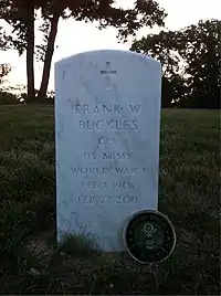 Buckles did not meet the criteria for burial at Arlington National Cemetery as he had never been in combat, but friends and family secured special permission from the federal government in 2008.[70] That was accomplished with the help of Ross Perot, who had met him at a history seminar in 2001, and who intervened in 2008 with the White House regarding a final resting place.[71]