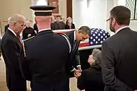 A ceremony at Arlington National Cemetery's Memorial Amphitheater Chapel preceded the interment on March 15.[99] During the ceremony prior to burial, President Barack Obama and Vice President Joe Biden paid their respects and met with the family.[100]