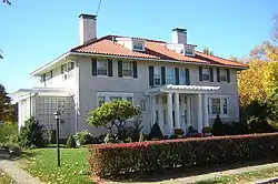 It is in a style known locally as "Prairie Bungalow", with elements of both the California Bungalow Style and the middle-west Prairie Style. It is unusual locally for its red tile roof, stucco exterior finish, and the Craftsman style portico with open rafters with shaped ends.[2]