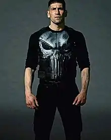 Drew Goddard felt that television was the best fit for the character, as the writers are "able to do things on the small screen that fit that character better than if we had to water him down for the movies."[16] Petrie and Marco Ramirez talked about creating their version of the character following the film versions, with Ramirez saying, "even if you know the character, you've never seen him like this. That was the big thing we wanted. There are four movies, eight hours and four actors. We've seen this guy. We think we know who he is, but even we learned that he's so much more." Petrie said, "We hope to make people forget what they've seen before, whether they've loved it or not."[17] In order to get in the correct mindset to portray Castle, Bernthal trained with military members, along with receiving weapon training. Bernthal also "had to put myself in as dark of place as possible" to connect with "the emptiness inside" Castle, and isolate himself, including walking across the Brooklyn Bridge to get to set "to shed any outside influence of joy."[18] Rosario Dawson, who felt Matt Murdock behaved like the Punisher in Daredevil season one, felt it would "be really interesting to see how [the writers] differentiate" the two in the second season.[19] Describing the character, Bernthal said, "As a man who put his [life] on the line and really went through the ultimate sacrifice for this country in his involvement in the military. He's a guy who brought the war home with him [in] the worst possible way. There are a lot of iterations of this character and in all of them it's a man who's gone through this unbelievable trauma and what's interesting about our take on him is how this trauma reshapes his own philosophy."[18] Bernthal also talked about the character's 'superpowers', saying, "If I got one thing from the comics, I think, as far as superpowers... his superpower is his rage. His superpower is that he is not going to quit, and he is going to go forward no matter what. And that's as human and grounded a quality as I think as this sort of genre could have".[20]