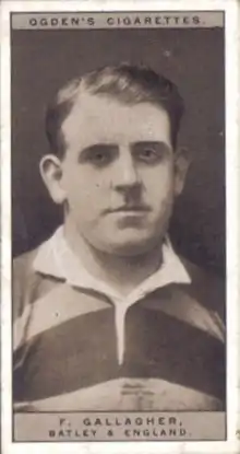 Frank Gallagher (c. 1895 – 20 March 1966), was an English professional rugby league footballer who played in the 1920s. He played at representative level for Great Britain, England and Yorkshire, and at club level for Dewsbury, Batley and Leeds, as a stand-off, scrum-half, second-row, or loose forward, i.e. number 6, 7, 11 or 12, or, 13, during the era of contested scrums.[1]