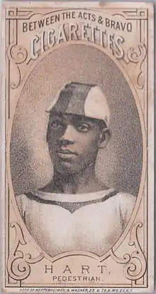 Born in 1856 as Fred Hichborn, Hart immigrated to Boston from Haiti as a teenager and worked as a grocery store clerk before joining races to earn extra money.[1] [4] Frank Hart was chosen as his stage name, and he was variously also known as "The Negro Wonder" and "Black Dan", after his mentor and promoter Dan O'Leary.[1] Hart competed in at least 63 six-day pedestrian races from 1879-1902, winning 16 of them. Hart was ultimately one of the first black sports celebrities in America.[5][6]