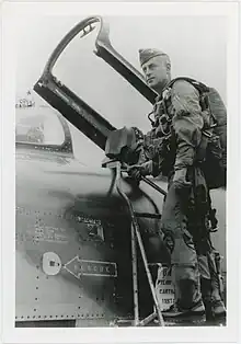 In September 1968, he assumed command of the 35th Tactical Fighter Wing at Phan Rang Air Base in South Vietnam, during the Vietnam War. He flew 235 combat missions in the F-100 Super Sabre over South Vietnam and was awarded a second Distinguished Flying Cross for "extraordinary achievement while participating in aerial flight".[4][1]