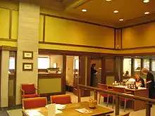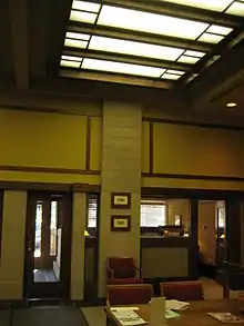 The building's most distinctive architectural feature is the fireplace, uncommon in office buildings, and the structure's only feature to incorporate Roman brick.[2][3] The present-day structure consists of one open, interior space, while Wright's original design divided the building into two sections. One section was used as Smith's real estate office, the other as the bank.[2] Wright also designed a full set of furniture for both offices, although much of it has been sold over the years.[2] One of the pieces of Wright-designed furniture in the building was a round-backed chair. The chair was at least the second attempt at a round-backed chair by Wright; an earlier, more successful attempt was completed in the Darwin D. Martin House. The chair has a bent-wood back, and rounded seat and stretchers. The total integration of the design is less successful than that used in the Martin House.[6] Other interior features include a now electrically lit skylight, oak trim, and exposed stonework.[3]