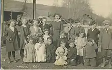 Matsura photograph taken in Okanogan, March 2, 1912, for the fifth birthday of Ardes Nelson (2nd from right, front row), her brother Tyler is 4th from right, front row, holding their sister Brownie. Ardes Nelson was the eldest granddaughter of Jess Dillabough, Matsura's former employer.