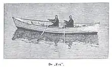 Using their life savings, Harbo and Samuelsen had an 18-foot ship-lap (clinker-built) oak rowboat built with water-resistant cedar sheathing. It included a couple of watertight flotation compartments, two rowing benches, and rails to help them right it if capsized––a feature that saved their lives in mid-ocean. The boat was carrying American flags, and was named "Fox" in honor of the editor. With a compass, a sextant, a copy of the Nautical Almanac, oilskins and three sets of oars lashed safely in place, they set out from The Battery in New York City on June 6, 1896. They arrived fifty-five days later in the Isles of Scilly off the southwestern tip of the Cornish peninsula of Great Britain.[8]