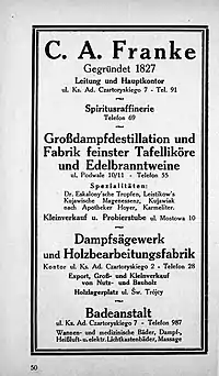 Carl August Franke arrived in Bromberg in 1827 from Leszno, together with his wife Caroline Keymer. He established a distillery business, the C.A. Franke Spiritusraffinerie with a modest capital of 500 thalers.[1] The workshop was located at Bruckenstraße 10 (in today's Mostowa street).[2] C.A. Franke died in 1853 in Bydgoszcz.