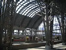 West of the entrance building is the train shed. It consists of five steel and glass halls that cover the platforms over a length of 186 metres. The three larger halls are 56 metres wide and 28 metres high, the two outer small halls are 31 metres wide and 20 metres high.[18] The transverse platform, which allows access to the 24 above-ground mainline tracks in the train shed, extends across the entire width of the halls, only the outer track 1a can only be reached indirectly via the platform on track 1. The platforms, which are at right angles to the transverse platform, are also connected by an underpass (transverse tunnel) connected to the west. Outside the platform halls, the platforms continue with canopies from different eras.