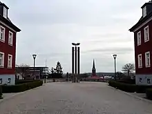 The bus station is located on the station forecourt in front of the entrance building. The tram stops are located about 100 metres north of the entrance building at the underpass to Beresinchen (the Beresinchentunnel). From there, Bahnhofsstraße (station street) runs to the north over former railway-owned land towards the city centre. The former railway buildings were almost completely destroyed in World War II and were replaced by new buildings. Between the bus station and the tram stop is the newly reconstructed "City Residence Hotel Frankfurt Oder". The Kiliansberg settlement on the east side of the station forecourt was built about the same time as the reconstruction of the station between 1922 and 1924 and was also designed by Beringer. It is located on a steep slope above the Oder valley and was built by the Ostmark company with apartments for railway workers as part of the transfer of the Deutsche Reichsbahn divisional administration to Frankfurt. Between the apartments designed by Beringer is a monument made by the sculptor Furstenberg for 1535 railwaymen who died in the First World War. Railway apartments and the monument are on the list of cultural monuments of Brandenburg.[14]