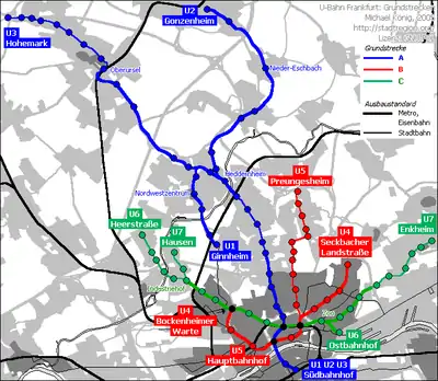 The U-Bahn consists of nine lines, U1 to U9, running on three primary routes based on the three tunnels, with a planned fourth route from the suburbs to the Frankfurt Hauptbahnhof only partially completed.