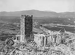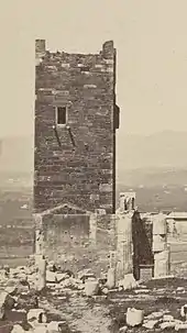 The tower was dismantled in 1874,[7][11] as part of a wider cleaning-up of the Acropolis from post-Classical buildings, a project initiated and financed by Heinrich Schliemann.[10] The demolition of such an "integral part of the Athenian horizon" (Théophile Gautier) drew considerable criticism at the time.[10] Work began on 2 July, amid great publicity organised by Schliemann, but a few days later the demolition was halted at the order of King George I, prompting Schliemann to write an indignant letter of protest to the King. Despite the latter's opposition, the tower was eventually torn down.[12] The eminent historian of Frankish Greece, William Miller, later called it "an act of vandalism unworthy of any people imbued with a sense of the continuity of history",[7] and "pedantic barbarism".[13]
