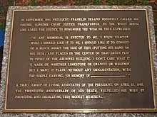 During a conversation that he had with Supreme Court Associate Justice Felix Frankfurter in 1941, Roosevelt said that if he were to have a monument in Washington, it should be in front of the National Archives and should be no larger than his desk. A 3-foot (0.9 m) tall, 7-foot (2.1 m) long, 4-foot (1.2 m) wide block of white marble was subsequently dedicated in 1965 as his memorial near the southeast corner of Ninth Street NW and Pennsylvania Avenue NW, within a lawn in front of the National Archives Building.[10] The engraved words on the memorial state: "In Memory of Franklin Delano Roosevelt 1882–1945".[11]