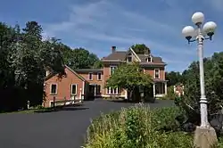 The Franklin Fairbanks House stands west of downtown St. Johnsbury, on the south side of Western Avenue (United States Route 2), between the Fairbanks Inn and the St. Johnsbury School. It is a 2+1⁄2-story wood-frame structure, with a hip roof, clapboarded exterior, and brick foundation. It has a basic T-shaped layout, with gabled projections to both sides, with its main facade oriented facing east. It has high-style Italianate decorative features, including roof dormers with finials, a bracketed cornice, polygonal window bays, and a porch with chamfered posts. A carriage barn is attached at the southern end.[2]