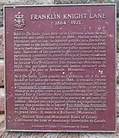 In November 1921, Lane Peak in Mount Rainier National Park was named for the former Secretary.[75] Lane was named a National Historic Person on the advice of the Historic Sites and Monuments Board of Canada on May 19, 1938.[76] A federal plaque was affixed to a cairn reflecting that honor near his DeSable, PEI, birthplace. Other tributes to Lane included a World War II Liberty ship, a New York City high school, and a California redwood grove.[9] Lane's patriotic essay "Makers of the Flag" adapted from a speech he delivered to Interior Department employees on Flag Day 1914, continues to be reprinted as a speech and in schoolbooks.[77][78]