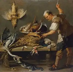Snyders typically depicted game in the stage before it is prepared as food. These dead animals therefore resemble hunting trophies, which were often not even intended as food but rather for stuffing. Snyders often included live animals such as cats to create a contrast between the animate and inanimate elements.[12] Snyders' large game pieces were very influential and the Dutch painter Jan Davidsz. de Heem, who worked in Antwerp for a significant period of time took inspiration from Snyders' work to develop his own large-scale game pieces.[13]
