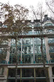 La Semeuse de Paris was built between 1910 and 1912 to house the credit department of La Samaritaine department stores for lending to the poorest customers. The art nouveau building also contained apartments. It was listed as a historical monument on 11 December 2000.[9] In 1925 Cognacq was authorized to construct a second building. Jourdain and Henri Sauvage began work in January 1926, and completed it in September 1928 after many changes from the original plan. At the request of the prefecture the steel frame was given a cream-colored stone exterior. Jourdain built Store 3 on the lot bounded by the rues de Rivoli, Pont-Neuf and Boucher between 1930 and 1933. The interior is best preserved in Store 2, with a glass roof, wide staircases and characteristic bright blue, green and orange colors.[7]