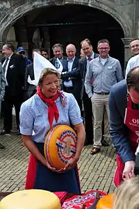 Frau Antje was born during the 1959 edition of the Berlin International Green Week, a trade fair for agriculture and nutrition. Apparently, a young Dutch woman from The Hague named Antje was working the booth of the Dutch Dairy Organization (NZB), serving cheese; when she fell ill and her colleagues kept being asked "where Frau Antje was", the chief of the NZB decided there was commercial potential in the idea. He hired Kitty Janssen to be the first Frau Antje (1961), dressed in a supposedly traditional Dutch costume and wearing wooden shoes.[1]