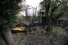 Dibnah had another course of chemotherapy, but this time the treatment was unsuccessful. Undeterred, he began to dig a replica coal mine in the back garden of his home. Although the sight of pithead gear may have been considered by his neighbours to be unusual, as a child raised in Bolton, he had been surrounded by pits such as Ladyshore Colliery and had long harboured an interest in mining. He had already assembled the wooden pithead gear and was planning to sink a 100-foot (30 m) brick-lined shaft below this into the hillside.[81] At the bottom of the shaft, a horizontal tunnel would have led out to the steep side of the valley above which his garden sits. The intention was to have a narrow gauge railway running along the tunnel, back up the hillside on a rope-hauled inclined plane, returning to the pithead. The ultimate aim was to be able to demonstrate the basic working of an early colliery. Seven years before his diagnosis, therefore, Dibnah had sourced drawings of suitable pithead gear and built a frame from timber and iron bolts. He had applied for and was given planning permission to erect the structure, but made no mention of his wish to dig a shaft underneath it. The BBC decided to make a documentary on Dibnah's proposed mine, which would entail his travelling once again around the country, visiting working collieries and heritage mines. Filming started late in 2003, by which time Dibnah and his friend Alf Molyneux had already made a start on the shaft.[82]