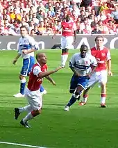 In 2003–04 Ljungberg made 30 league appearances during Arsenal's unbeaten Invincibles season.[29] That season he scored the winning goal against rivals Tottenham Hotspur at Highbury.[30] The following season (2004–05) Ljungberg played in his fourth FA Cup final, when he came on as a substitute and scored one of Arsenal's penalties in the shootout as they defeated Manchester United.[31]