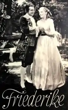 Frederica (German: Friederike) is a 1932 German historical musical drama film directed by Fritz Friedmann-Frederich and starring Mady Christians, Hans-Heinz Bollmann and Veit Harlan.[1] It is based on the 1928 operetta of the same name by Franz Lehar which depicts the love affair between Friederike Brion and the young Goethe.