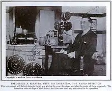 Kolster worked at the National Bureau of Standards from 1911 to 1921. While at the NBS, he pioneered a number of developments in radio signal detection and radio compass work, including the Kolster Decremeter. In 1913, he convinced the Bureau of Lighthouses to install radio beacons at all important lighthouses and light ships.[2] Kolster also patented in 1915 a radio direction finder, used in the subsequent World War I by U.S. destroyers at sea to locate German submarines.[3]