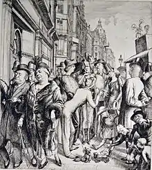 During his short artistic career Dixon used his 'keen sense of observation[8]' to produce intricate etchings that capture wonderfully a sense of the period. Contemporary critics noted his ability to depict 'human characteristics of different types', 'treated in a realistic and humorous manner'.[9]