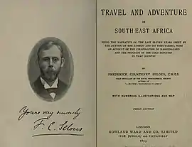 Frontpage of 1st edition Travel And Adventure In South-East Africa, 1893, with Selous portrait and autograph.