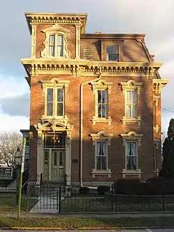 Fabing arranged for the construction of the present house in 1859,[1] before he entered into the gasworks business.[2] Three stories tall and built of brick,[3] Fabing's house is one of the most distinctive pieces of architecture in the city. Most surviving buildings in Fremont are no older than the late nineteenth century, and various vernacular styles are prevalent; the 1850s Second Empire architecture of the Fabing House is radically different from many surrounding structures. Among its prominent features are a square tower with a mansard roof, an ornamental overdoor, a large bracketed cornice with dentils, elaborate metalwork and dormer windows, a multi-part frieze, and decorative hoodmolds.[2]